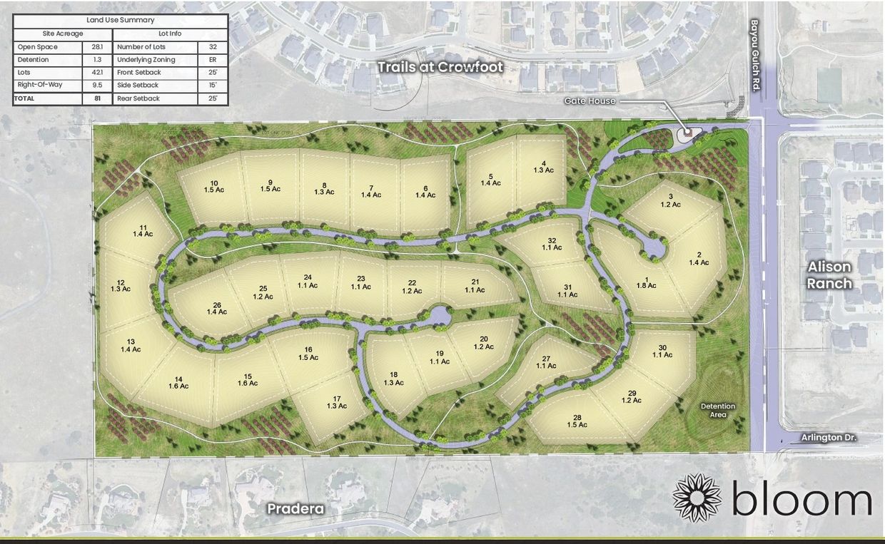 Bloom is an opportunity in Douglas County to retreat to a more open landscape. Peaceful vistas, gently rolling terrain, an indigenous wildlife and vegetation, and seclusion from the pressures of urban life are often the images that come to mind when describing a classic Western landscape in the Colorado. At Bloom, just such a piece of historic Colorado ranchland has been masterfully designed to preserve and enhance those images well into the next century.